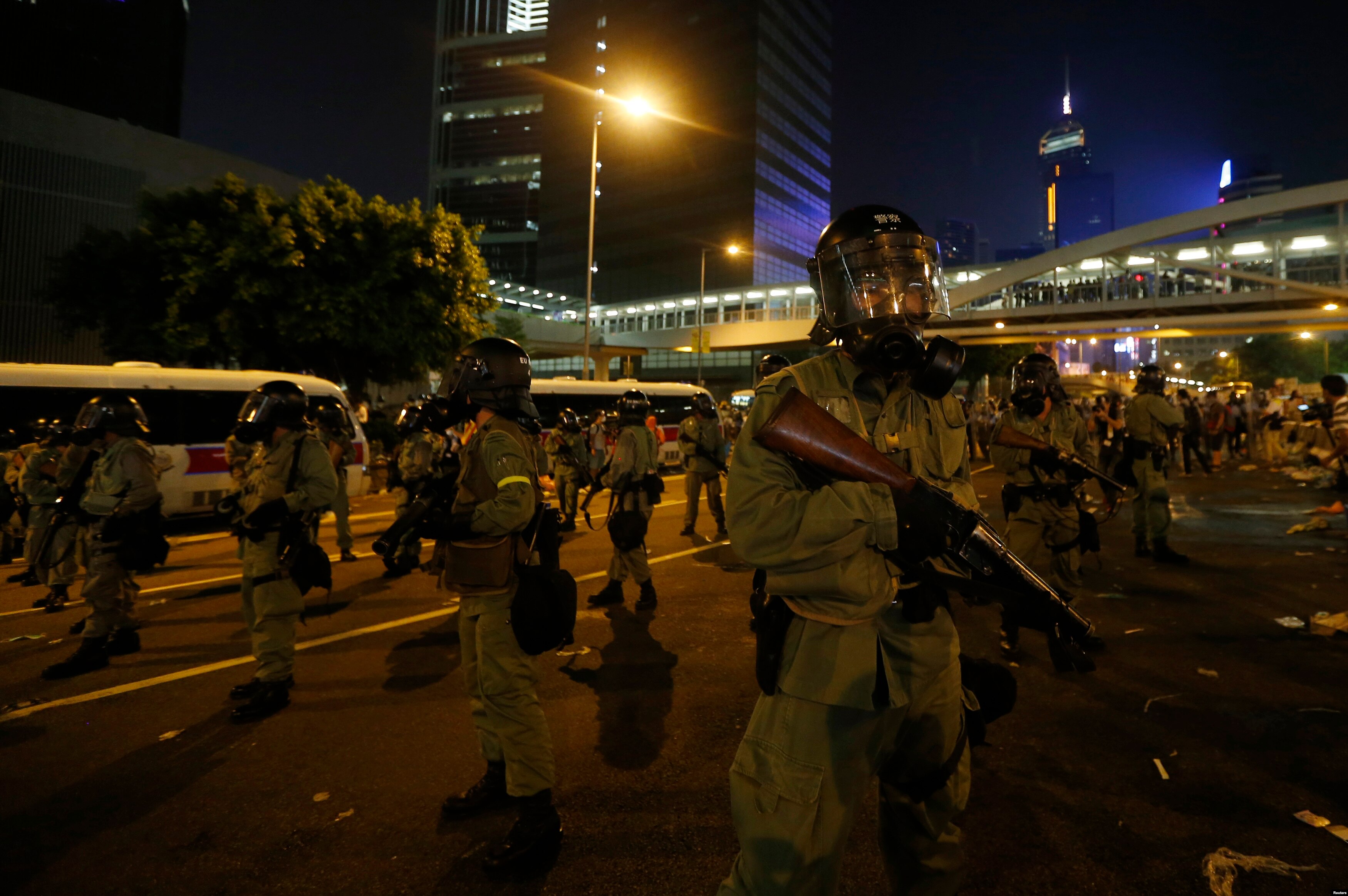 | Riot policemen with tear gas launchers stand guard as protesters block the main street to the financial Central district outside the government headquarters in Hong Kong, Sept. 28, 2014. |