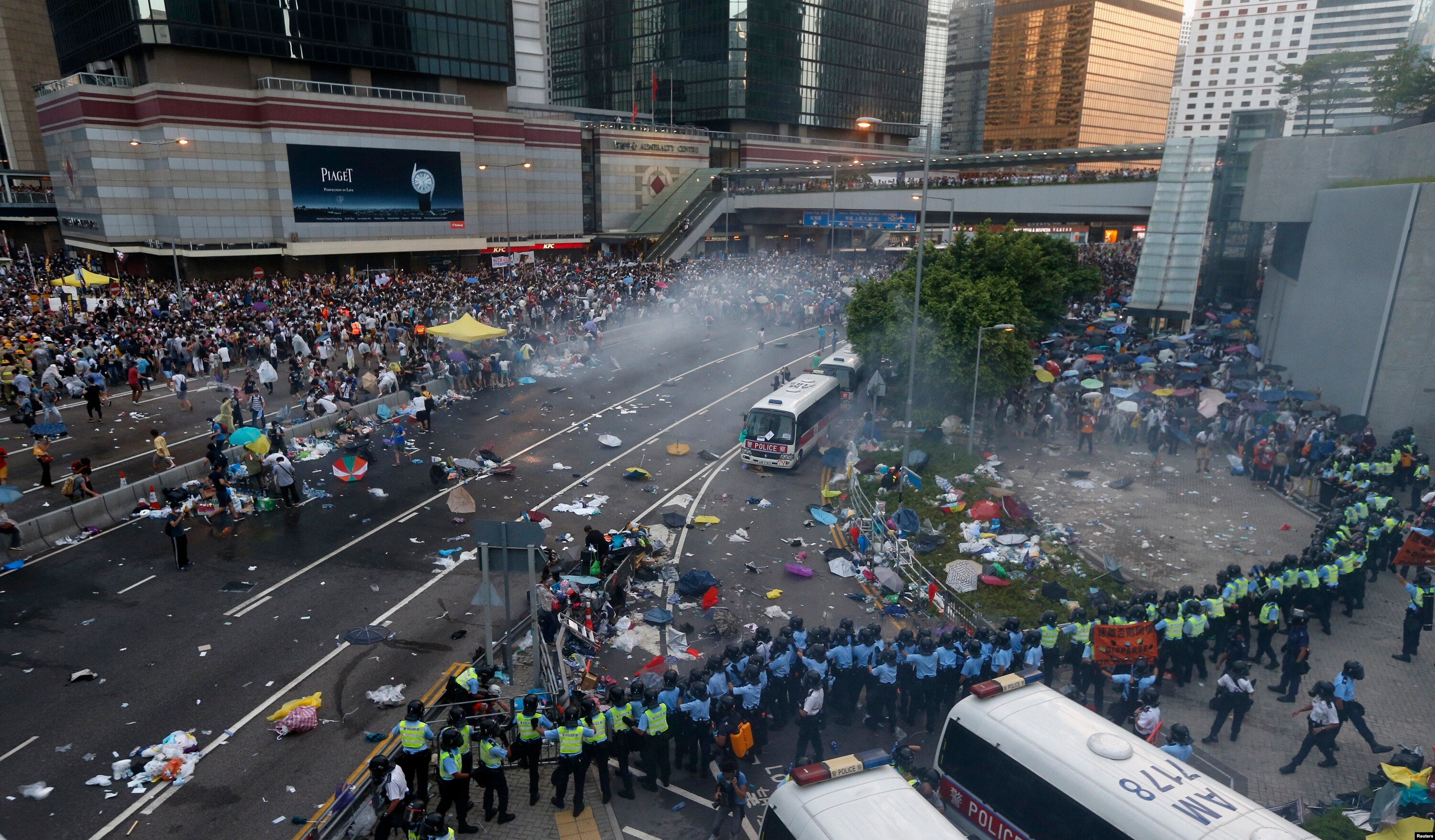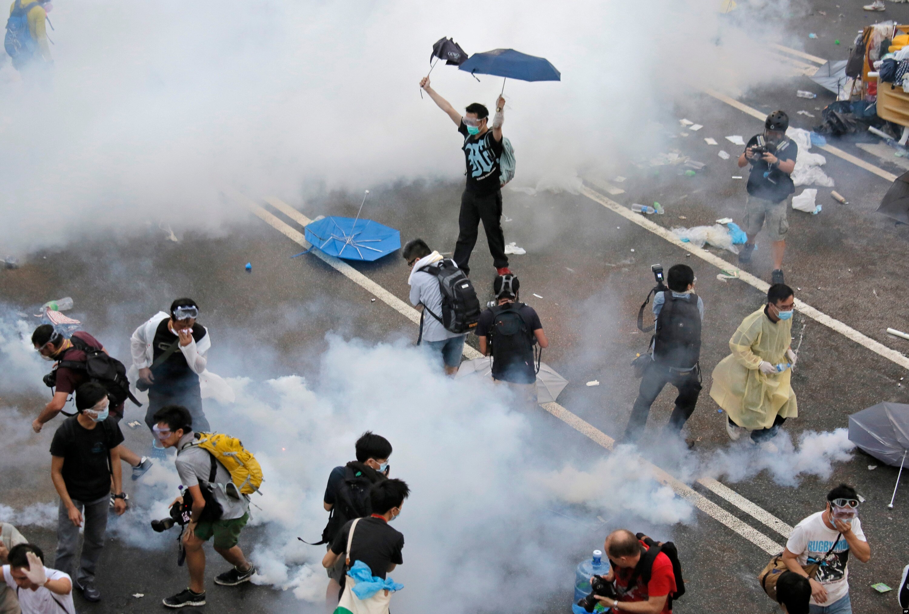 | Protesters disperse as riot police fire teargas after thousands of protesters blocked the main street to the financial Central district outside the government headquarters in Hong Kong. |