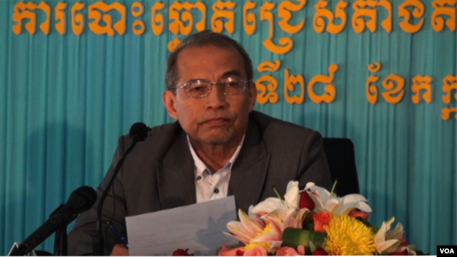 លោក អ៊ឹម សួស្តី ប្រធាន គ.ជ.ប. ក្នុងសន្និសីទ ព័ត៌មាន កាលពីថ្ងៃ ទី២៧ ខែកក្កដា ឆ្នាំ២០១៣។