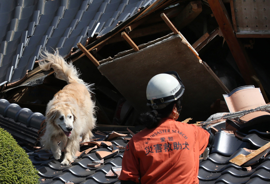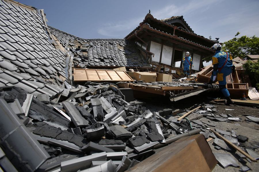 in collapsed houses in Mashiki, Kumamoto prefecture, on April 15, 2016. |