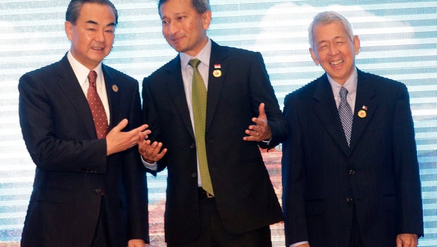Chinese Foreign Minister Wang Yi, left, talks to Singapore's Foreign Minister Vivian Balakrishnan, center, and Philippine Foreign Secreatary Perfecto Yasay, during the Association of Southeast Asian Nations (ASEAN) - China Foreign Ministers' Meeting in Vientiane, Laos, Monday, July 25, 2016.