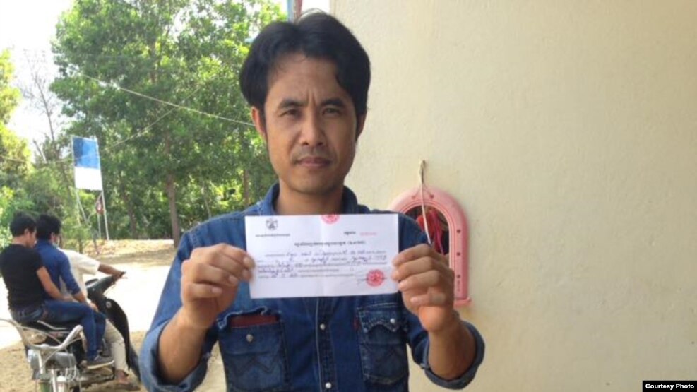 | Chhoun Chheng shows his registration slip after authority in Pailin province allowed him to register there. Chheng was refused twice before at two other provinces. |