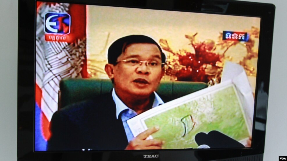 | FILE - Prime Minister Hun Sen appears on state-run TVK during a special live broadcast on Tuesday September 08, 2015 to rebuke opposition party's claims about the map and border demarcation with Vietnam. (Neou Vannarin/VOA Khmer) |