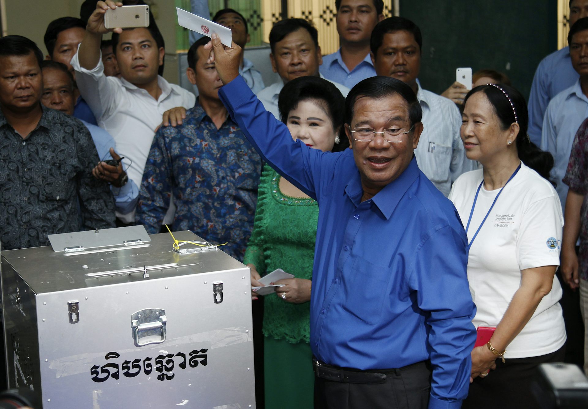 | A democrat? Cambodian Prime Minister Hun Sen casts his ballot during local council elections, June 2017. EPA Images |